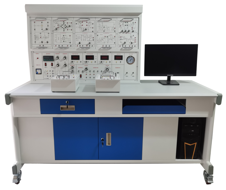 2、實訓桌:鐵(tiě)質雙層亞光密紋噴塑結構或全鋼框架結構,實訓(xùn)桌下方配有抽屜與元(yuán)器件儲存櫃,用於(yú)存放元器件,右邊預留放電腦位置(zhì)。