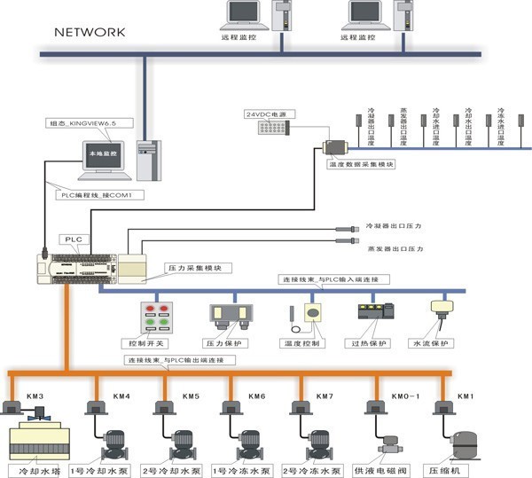 中央空调实训考(kǎo)核台采用6匹水冷机组,不锈钢框架结(jié)构,终端建立一个专门房间进行(háng)客户(hù)的模拟,大厅的模拟直接利用(yòng)教室原来空间,采(cǎi)用分水器和集水器对(duì)冷量或热量(liàng)进行分配调节,整个中央空调采用三菱FX2n-48MR PLC可编程控制器及工业总线控制,由计算机通过(guò)通信总线与PLC进行通信(xìn),控制整个中央空调的运行。空调的运行参数由(yóu)各类传感器(qì)进行采集,并通过通信(xìn)总线送入计算机中,通过专用中央空(kōng)调组(zǔ)态控制软件进行实时监(jiān)控。组态软件要求能够以动画的形式同步显(xiǎn)示(shì)系(xì)统的设备结构、控制原理和(hé)流程。