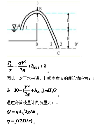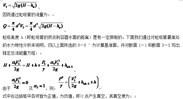 由上式可以看出,虹(hóng)吸管引流液体的能量来自虹吸管出口至容器内水面间的位能(位置水头)H,它的一部分用于克服虹吸(xī)管(guǎn)内的阻力,即(jí)损失能量hw,另一部分用于转(zhuǎn)变为流(liú)速(sù)水头,以保证有一定的流量流出。由(yóu)此可得虹(hóng)吸管内的断面平均流速为: