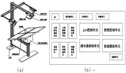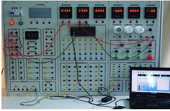 光伏發電控製監控係統由電(diàn)池板單元、太陽能(néng)控製(zhì)器(qì)單元、蓄電池單元、保險單(dān)元、陽光傳感(gǎn)器、傳感器限位單元、模擬太陽單元、兩軸聯動單元、plc控製單元(yuán)、繼電器(qì)單(dān)元、按鈕及按鈕接線單元、和(hé)相應的逆變器儀(yí)表電源(yuán)組成。光伏發電控製監控係統采用接插線的(de)形式進行接線,方便學(xué)生自行設計(jì)實訓(xùn)。