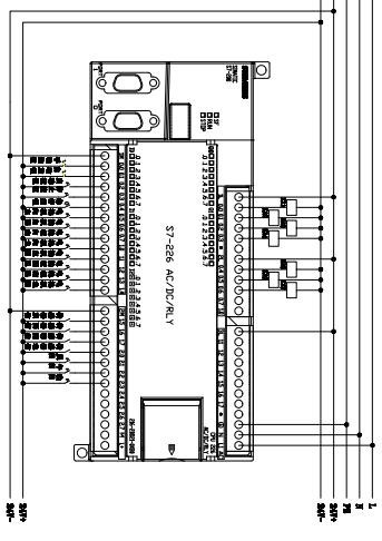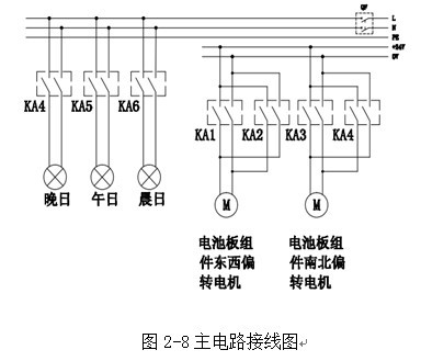 按照(zhào)接線圖鏈接線路,控製兩軸聯動係統追蹤最佳發電位置。Plc接線圖在附表5.1,通過plc程序(xù)控製電機和燈完成最佳位置跟(gēn)蹤。主電路接線(xiàn)圖如圖(tú)2-8所示: