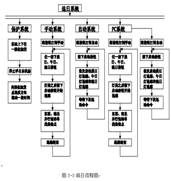 3、追日流程: 追日係(xì)統是由plc程序控製光源(yuán)模擬跟蹤裝置運行,追日流程圖(tú)如圖3-3所示(shì):