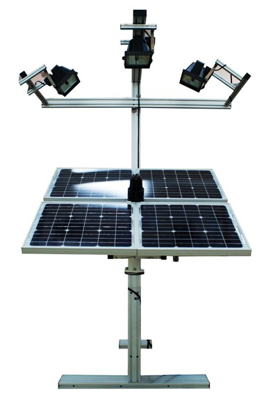 1、光(guāng)源模擬(nǐ)跟(gēn)蹤裝置:由4塊太陽能電池板(bǎn)組件、3盞300W投射燈、追日跟蹤傳感器(qì)、水平和俯仰方向運動機構、直流電動機和支架組成。