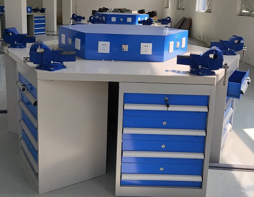 3、六工位鉗工桌配有6台工具櫃,工具櫃為4抽設計,加厚單軌軸承抽屜,承重高、使用壽命有(yǒu)保障,並設計有安全鉤。