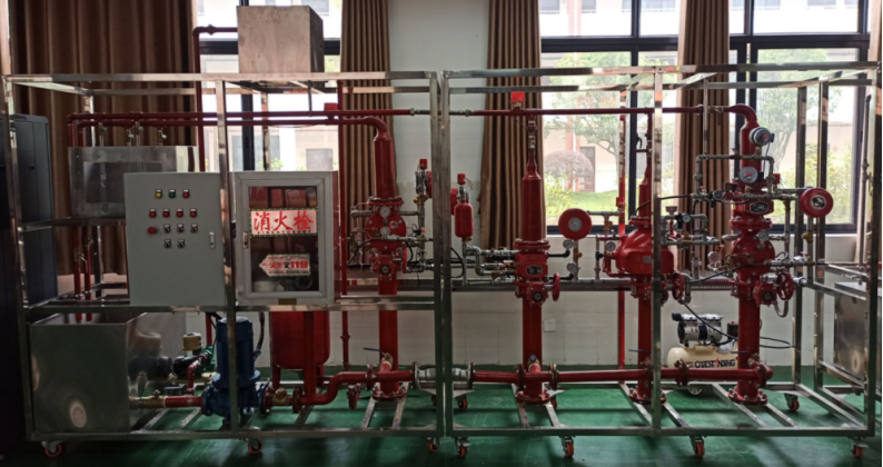 樓宇消防聯動(dòng)滅(miè)火綜合實訓係統-為(wéi)消防水滅火係統,由低位消防水箱,消防水泵,穩壓增壓設備,消火栓(shuān)箱,水帶(dài),水槍(qiāng)等組成。可以演示消火水滅火係統的基本組成,以及(jí)火災發生時係統的啟動與運行原理;2)自(zì)動噴水(shuǐ)滅火係統與(yǔ)消火栓係統共用低位消防水箱與屋頂消防水(shuǐ)箱,並由消防水泵、穩壓增(zēng)壓設備,濕式報警閥,水流指示器,噴頭,末端試水裝置組成(chéng)完整的自動噴水滅火係統,可以演(yǎn)示各種自動噴水滅火(huǒ)係統的組成與(yǔ)工作原理。