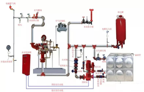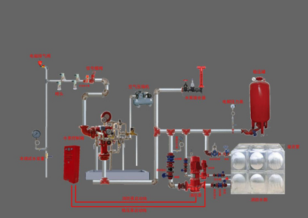 6、預作用係統在準工作(zuò)狀態時配水管道內不充水,由火災自動報警器自動開(kāi)啟預作用閥(fá)後,轉換為濕式係統,預(yù)作用係統由閉式噴頭(tóu)、預作(zuò)用閥組、充氣設備(不是必須有)、水流報警裝置、供水設施及供水配水管道等消防器材組(zǔ)成。
