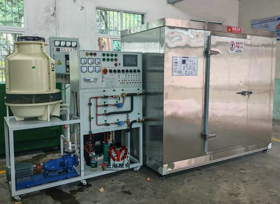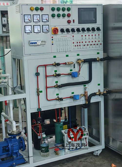 實訓裝置主要由控製櫃、水(shuǐ)冷製冷機組、高溫拚裝式冷庫,低溫拚裝式冷庫、主機實訓模塊(kuài)、連軸式冷卻水泵(bèng),冷卻塔,溫度和壓力(lì)傳感器等組成。