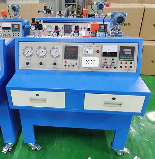 鋼質、台(tái)麵不小於1500×700mm,後側(cè)置高於台麵300mm左右的斜麵(miàn),便於布(bù)置各(gè)種輔助儀表(biǎo)等設(shè)備,包括0~0.1MPa壓力表,4~20mA電流表,0.7MPa的氣源壓力表,24VDC100W模塊。台(tái)內置模塊的抽屜,方(fāng)便替換(huàn)和放置。4個腳(jiǎo)安裝帶製動的萬(wàn)向滑輪,便於實驗台移動。