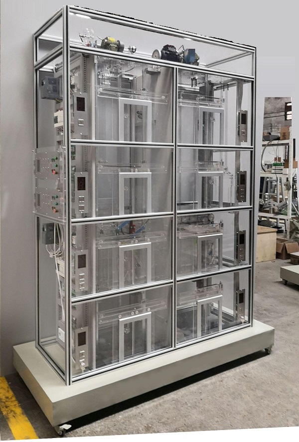 電梯教學模型(xíng)是根據最常見的升降(jiàng)式電梯結構,采用透明有機材料製(zhì)成,其結構與實際電梯完全相同,且幾乎具備了實際電梯的所有功能。電梯模型(xíng)大(dà)部分部件均是采用透明有機材料(liào)製成,使得電(diàn)梯的內部結構一目了然;同時,電梯的運行過程,以及每個動作都十分明了,且可(kě)以反複實際(jì)動手操作(zuò)。使學生能夠很直觀、透徹地(dì)了解、掌握電梯(tī)的(de)結構及其動作原理,達(dá)到事半(bàn)功倍的效(xiào)果。解決了以往電梯(tī)教學中單純的(de)理論教學方式或是參觀實際電梯時所帶來的不安全,無法全(quán)麵了解其內部結構及運(yùn)行過程等種種(zhǒng)實際問題。
