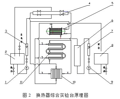 1、冷水泵,2、冷水箱,3、冷水渦輪流量傳感器,4、冷水順逆流換向閥門組,5、列管式換熱器,6、電加熱水箱,7、熱水(shuǐ)渦輪(lún)流量(liàng)傳感器,8、回水箱,9、熱水泵,10、板式換熱器,11、套管式換熱器