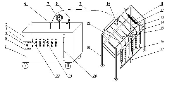 控製台、不(bú)鏽鋼支(zhī)架、由六組不同性能的傳熱管道(銅裸管、塗黑管、翅片管、玻璃絲棉保溫管(guǎn)、鋸末保溫管、鍍鉻管),蒸汽發生器、風機、壓力表等組成。