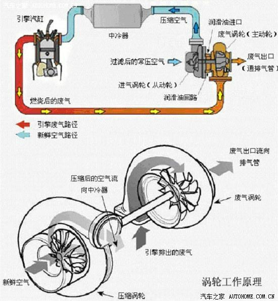 如果在相同的單位(wèi)時間裏,能夠把更多的空氣及燃油的(de)混合氣強製擠入汽缸(gāng)(燃燒室)進行壓縮燃爆動(dòng)作(小排氣量的引擎能“吸入”和大排氣(qì)量相同的空氣,提高容積效率),便能(néng)在相同的轉速下產生較自然進(jìn)氣發動機更大的動力(lì)輸出。渦輪(lún)增壓利用廢氣驅動,基本沒有額(é)外的能量損耗(對發動機沒有額外的負(fù)擔),便能(néng)輕(qīng)易地創造出大馬力,是非常聰明的設計。情形就像你拿一台電風扇向汽缸內吹,硬是把風往裏麵灌(guàn),使裏(lǐ)麵的空氣量增多,以得到較(jiào)大的馬力,隻是這個扇子不(bú)是用電動馬達(dá),而是用引擎排出的廢氣來驅動。
