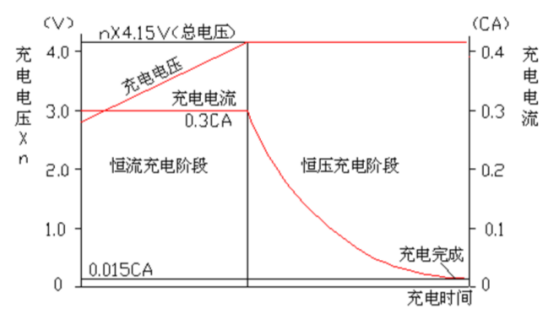 充電模式采用“限流、限(xiàn)壓”兩階段充電模式。充電(diàn)開始階段,一般采(cǎi)用最(zuì)佳充電(diàn)倍率(lǜ)(鋰離子電池為0.3CA)進行限流充電。在這一階段,由於電池的電動勢較低,即(jí)使電池充電電(diàn)壓不高,電池的充電流也(yě)會很大,必須對充電電流加以限製。所以(yǐ),這一階段的充電叫 “限流”充電(diàn),充電電流保持在限流值。隨著充電的(de)延續,電池電動勢不斷上升,電池(chí)的充電壓也不斷上升。當電池電壓(yā)上升到允許的最高充(chōng)電電壓時,保持恒壓充電。在這一階段,由於電池電動勢還在不斷上升,而充電(diàn)電壓又保持不變,所以電池的充電流呈雙曲線趨勢不斷下降,一直下降到零。但在實際充電過程中,當(dāng)充電電流減小到0.015CA時就可停止充電。這(zhè)一階段的充電叫(jiào)恒“恒壓”充電,這一階段(duàn)的充電電壓:U=E+IR=恒壓值。 充電過程及充電(diàn)電壓、電流的變化如圖7所示。