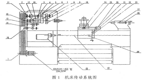 主軸的旋轉運動,從主電機經(jīng)皮帶輪(lún)l-2傳(chuán)動頭(tóu)箱1軸,由齒輪4-5、6-7、7-10齧合,及17-16、7-10齧合,變換雙速電機使主軸獲得(dé)4種正轉高速。