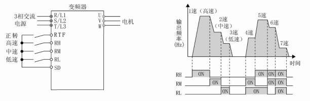 ②設(shè)定“高速頻率”Pr4為40,“高中速頻率(lǜ)”Pr5為30,“低速頻率”Pr6為20,