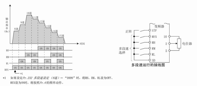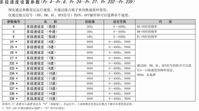 通過RH、RM、RL、REX信號的(de)組(zǔ)合,可以設定4速~15速。請在Pr.24~Pr.27、Pr.232~Pr.239 中設定運行頻率(初(chū)始值狀態下4速~15速為無法使用的設定)。