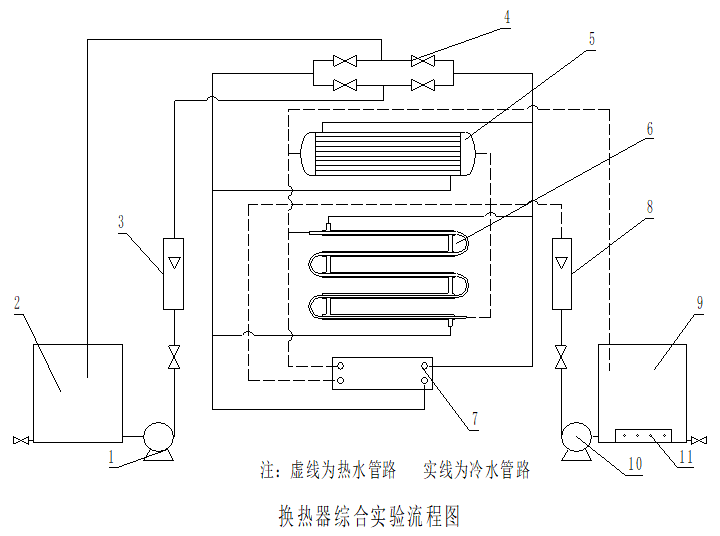 1.冷水泵 2冷水箱(xiāng) 3.冷水流量計 4.冷水順逆流閥門(mén)組 5.列管式換熱器 6.套(tào)管式換熱器 7.板式換熱器 8.熱水(shuǐ)流量計(jì) 9.熱水箱 10. 熱(rè)水泵(bèng) 11 電加熱器 巡檢儀溫度顯示:T1-熱水進口溫度;T2-熱水出口溫度; T3-冷水進口溫度;T4-冷(lěng)水出口溫度
