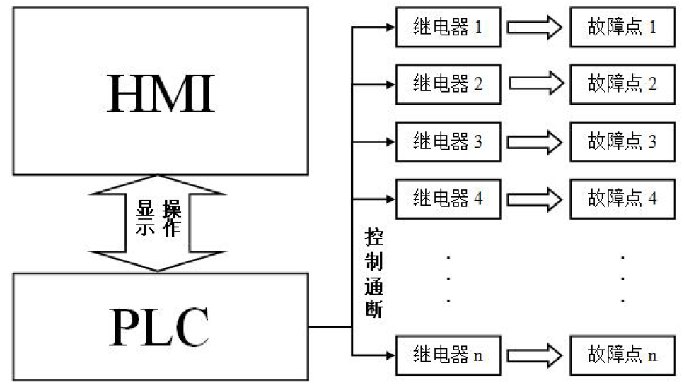 以上述維修電工故障排查考核實訓裝置的升(shēng)級改造為例(lì),本文以其中(zhōng)“CA6140型臥式車床”的考核裝置(原電路有11個故障點)展開闡述。該套方案是將原有考核(hé)實訓裝(zhuāng)置上的(de)操作按鈕(niǔ)升級為HMI組態棒圖,故(gù)障設置開關替換為繼電器,並加裝可編程處理器(PLC),實現故障設置和故障判斷的邏輯控製,組成一套智能電氣控製係(xì)統,整體如圖2所示。係統同時具備練習模式和考核模式,其中考核模式具有賬戶管(guǎn)理(lǐ)功能和掉電記錄功能,有更好的操作性和保密性,便於開展故障排查綜合實訓和技(jì)能鑒定。