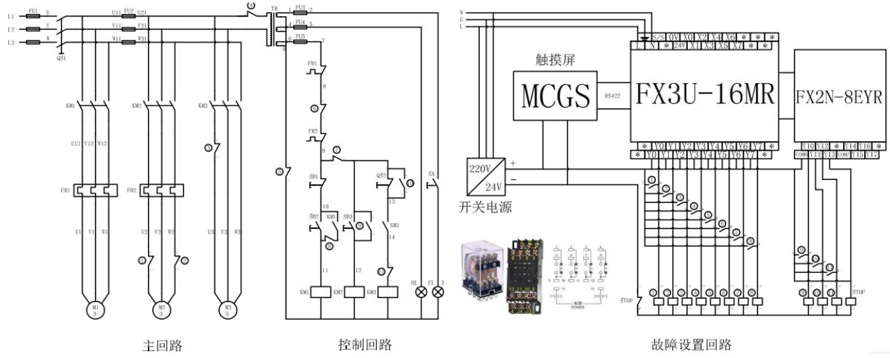 硬件回路圖(見圖(tú)3)可(kě)分為三塊:主回(huí)路、控製回路和控製(zhì)係統回路。其中主(zhǔ)回路和控製回路作為“CA6140型臥式車床”的考核背景電路(lù)不做改動(dòng)。控製係統回路中,考慮成本因素,PLC可選用三菱的FX3U-16MR,並選用數字量擴展模塊FX2N-8EYR增(zēng)加輸入輸出點,觸摸屏選用昆侖通泰TPC7062KS(TX)7寸觸摸屏。為處理PLC輸出口(kǒu)COM端共(gòng)用問題和(hé)避免PLC輸出口信號燈的提示作用,增加12個繼電器轉接:其中11個繼電器的常開常閉觸點替代原故障設置船型開關,同時PLC的故障設置信息輸出采用脈衝形(xíng)式,輸出後繼電器自鎖狀態,1個繼電器用於清除故障,解(jiě)除自鎖。