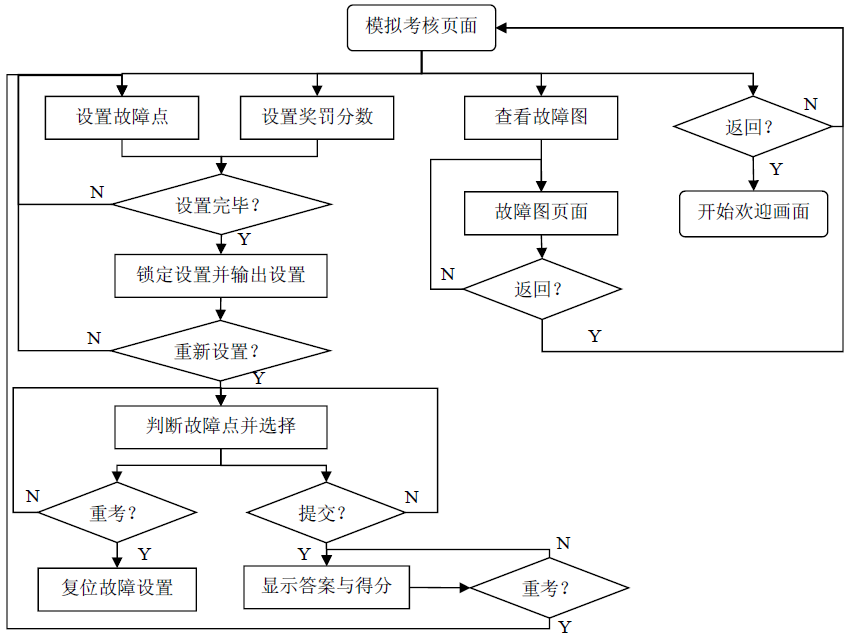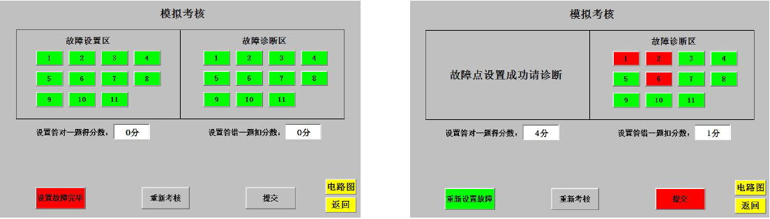 在該模式(shì)下,教師/學生設置完(wán)故障點和獎罰分數(鎖(suǒ)定前可修改),提交後控製係統鎖定設置並輸出故障信息,如有修改需求可清(qīng)零(líng)設置。然後交給(gěi)考試判斷,考生判(pàn)斷電路後輸入答案(提交前可修改),提交後係(xì)統將鎖定選擇,給出分數,並提供(gòng)實際故障點用於與診(zhěn)斷結果對(duì)比。在練習過程,考生可隨時點開電路圖查看電路。練(liàn)習完畢,教師/學生可複位重(chóng)新開始。流程如圖6展示。