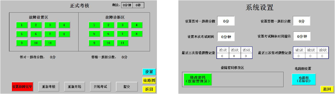 為了應對綜合實訓與技能鑒定兩種不同場合的實(shí)際使用情況,考核模式的操作權限(xiàn)設置(zhì)“教師(考評(píng)員)”與“管理員”兩種不同的用戶(hù)組,分別對應不同(tóng)的密碼。其中對故障(zhàng)設置(zhì)、故障判斷、係統設置和返回功能的操作權限對(duì)兩個用戶組均(jun1)開放。其中修改密碼權限僅對“管理員”用戶組開放,且“管理員”用戶組不僅能修改本組操作密碼,亦能修改“教師”用戶組的密(mì)碼,避免教師間修(xiū)改密(mì)碼缺(quē)乏溝通或者學生掌握密碼後隨意修改導致密(mì)碼丟失。