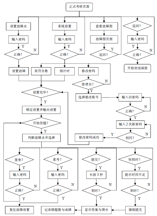 該模式下,隻有教師(考評員)/管理員可以登錄,登錄需驗證(zhèng)密碼。部分按鈕的操作亦需要密碼驗證(zhèng)。不同的賬戶登錄,需要驗證不同的密碼。其中管理員賬號還具有修(xiū)改密碼(mǎ)權限。其餘(yú)操作與練習模式基本一致。流程如圖(tú)7展示。