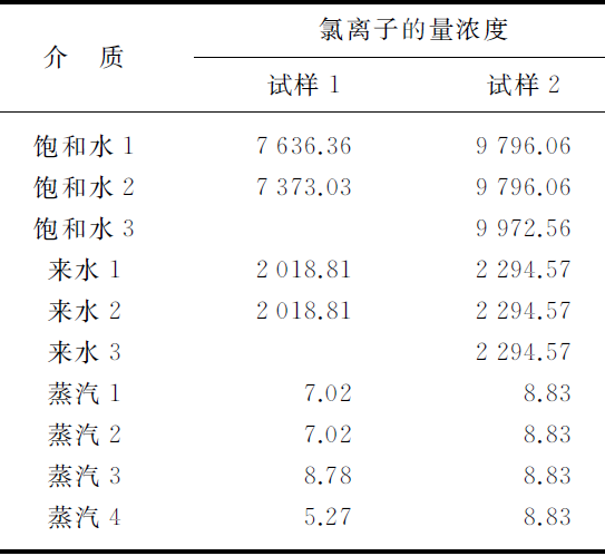 蒸汽狀態(tài)的(de)水不含有氯離(lí)子,通過化驗飽(bǎo)和水及蒸汽中的氯離子的量(liàng)濃度,可(kě)以得出(chū)汽中液態水的量濃度,氯離子化驗結(jié)果見表1所(suǒ)列。