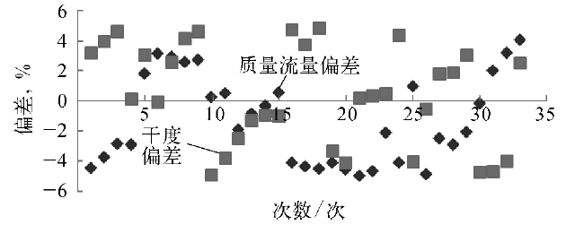 圖4 質量流量和(hé)幹度實驗結(jié)果相對偏差示意