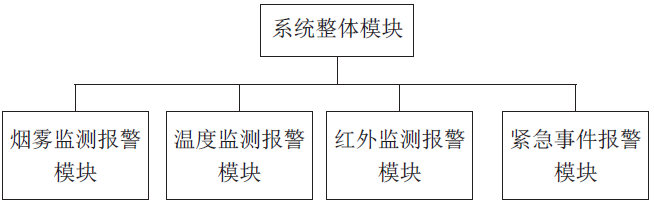 本次報(bào)警係統包含(hán)四個模塊組件,防盜防火報警係(xì)統功能模(mó)塊示意圖如圖3 所示。