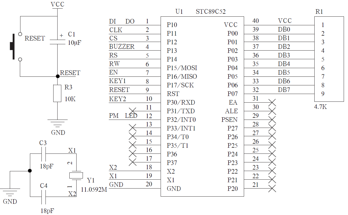 本次設計中單(dān)片機主(zhǔ)控電路(lù)示意圖如圖4 所示。針對智能(néng)防盜防火報警係統的(de)設計,最(zuì)小係統包括(kuò)單片機時鍾(zhōng)電路和複位電路。