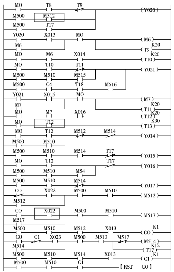 出料槽完成分選(xuǎn),首先要自動識別黑色尼龍、白色尼龍、金屬鋁(lǚ)塊3種物料,金屬鋁塊可用提供的金屬傳感器進行檢測(cè),白色尼龍依靠光纖傳感器進行檢測,黑色尼龍(lóng)隻有靠排除法進行確認,即從皮帶入料槽(cáo)檢測有料輸送帶開始運行到出料槽B的時間內,檢測不(bú)是金屬物料又不是白色物料即(jí)為黑色尼龍。這樣就可(kě)以依據內部繼電器、計數器、計(jì)時(shí)器、通(tōng)過電機的正反轉進(jìn)行控製,具體思路同上,考慮(lǜ)防止撞機等安全因素,完成上述要求的(de)程序設計,從(cóng)整體程序內摘錄部(bù)分程序。