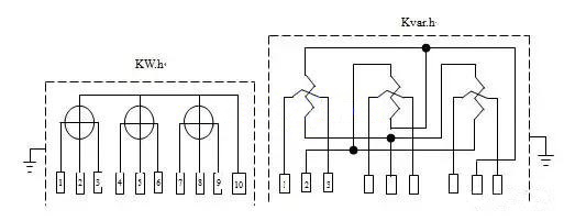 有功功率電表(biǎo)的電流量電磁線圈始端1、4、7各自接U相、V相、W相電壓互感器的二次側K1,其尾(wěi)端3、6、9各自先後(hòu)與無功功率表電流量電磁線圈的始端1、4、7相串連,無功功率表的電流量電磁線圈的尾端3、6、9各自收到電壓互感器的二次側K2,且K2接地(dì)裝置。(這裏的電線接頭為PE線,事實上3、6、9接進PE線上(shàng))