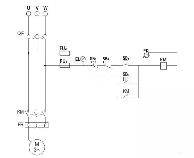 從電源開關下邊W相考(kǎo)慮接斷路器FU1 FU1的小組出線線接常閉按鍵SB1 SB1的小組出線線接常閉按鍵SB2 SB2的小組出線線接開與關按鍵SB3 SB3的小組出線線接至交(jiāo)流接觸器電(diàn)磁線圈KM KM的小組出線線接熱繼(jì)器常閉點FR的9六號 FR的小組出線(xiàn)端95號引至斷路器FU2 FU2的小(xiǎo)組出線線(xiàn)接U相;將開與關按鍵SB4並在開與關按(àn)鍵SB3兩邊;將交流接觸器延時(shí)繼電器(qì)KM並在開與關按鍵SB4兩端;最(zuì)終接顯示燈。
