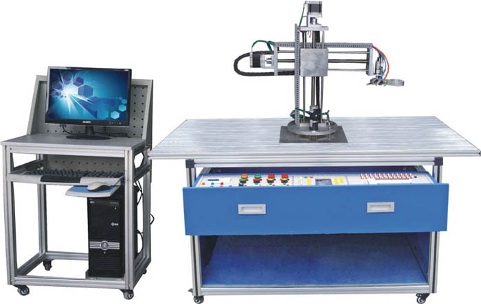 本設備為坐標式(shì)機械手,可完成機械手旋轉(zhuǎn)、手臂垂直上下移動、手(shǒu)臂水平移動,手爪旋轉四個自由度的位置(zhì)精確控製。同時配置(zhì)晶體管式可編(biān)程控製器,用於對整個機械手進行複雜的位置(zhì)控製。通過在該實訓裝置上(shàng)的實訓和操作,學生(shēng)可熟練掌握PLC高級指令、傳感器、旋轉編碼器、氣(qì)動控製、步進電機、氣動手指(zhǐ)、直流電機、精確機械位置傳動等技術的綜合應(yīng)用。