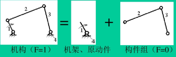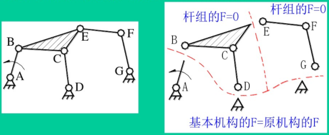 因為機構具有(yǒu)確定運動的條件:原動件數=F,所(suǒ)以如將機構的機架和原動件(稱為基(jī)本(běn)機構)與其餘構件拆分開,則(zé)由其餘構件構成的構件(jiàn)組的F=0。
