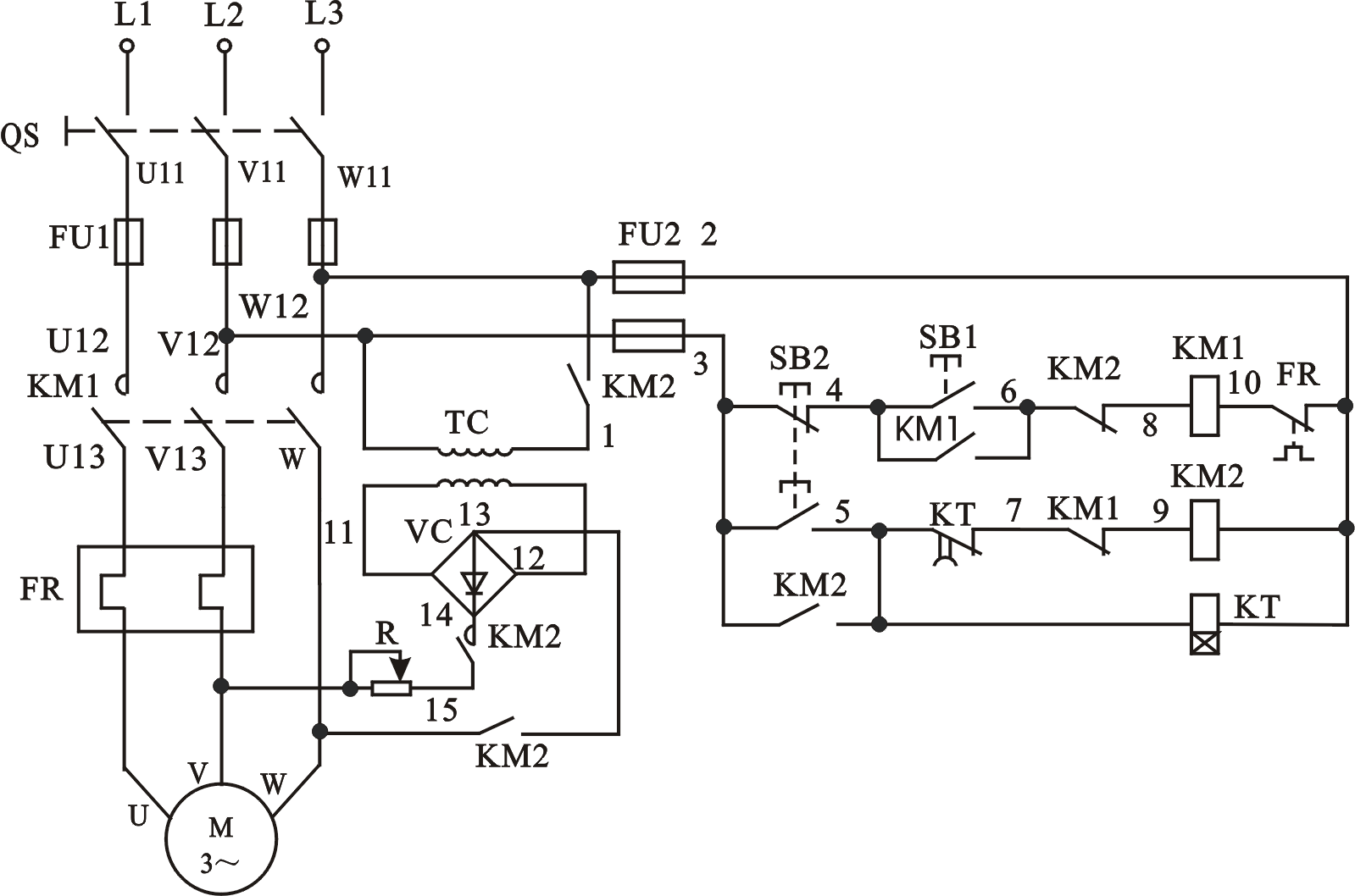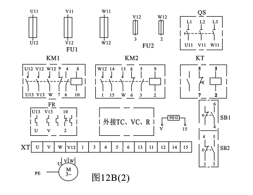 該控製線路適用於(yú)10KW以上功率較大的電動機的能耗製動,控(kòng)製線路中的直(zhí)流電源由(yóu)單相橋式(shì)整流器供給,電阻R用以調節電(diàn)流,從而調節製動強度。