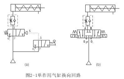 圖1(a)是采用一個(gè)二位三通控閥控製單作用彈簧氣缸伸縮的回路。在圖中當有氣控(kòng)製信號時,換向閥優位接通,氣缸活塞杆(gǎn)伸出工作,一旦氣控信號消失,換向閥(fá)則自動複位,活塞杆在彈(dàn)簧力的作用下縮回。