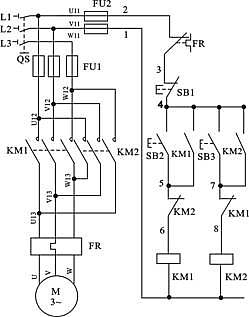 反(fǎn)轉(zhuǎn)接觸器(qì)KM2通電(diàn)動作,主觸頭閉合,主電路按W1、V1、U1相序接通,電動機電源相序改變了,故電動機(jī)作反向旋轉。