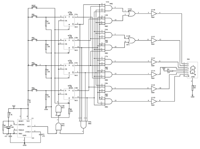 4個D觸發器的D端(duān)作為搶答操(cāo)作狀態輸入,設A組先按按(àn)鈕,A組的D=1,在CP作用下,QA=1, =0。由於(yú) =0,使(shǐ)門G1輸出為(wéi)1,G2門輸出為0,封鎖了CP,使其他後按的D狀態傳不到Q端。當A輸出為1時,其他輸出為0,通過(guò)譯碼電路,使數碼管顯示“A”字符。字符顯示譯碼器的譯碼表如下。| QA QB QC QD | a b c d e f g |