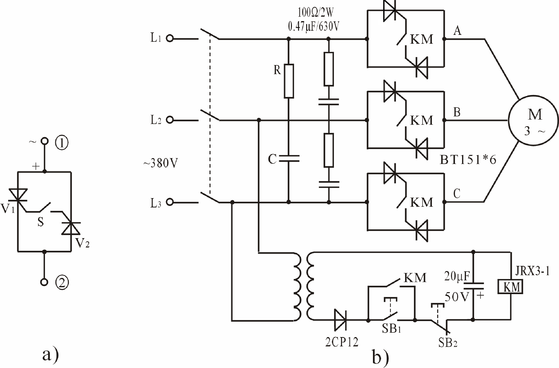 2) 當晶閘管(guǎn)的門極開路,陽極-陰極間(jiān)承受反向電壓(yā)時,管內有反向漏電電流存在,在圖a)中,假定某一時刻①端為電源正半(bàn)周,則晶閘管V1承受正向電壓,V2承受反向(xiàng)電壓(yā),管(guǎn)內有由(yóu)①向②的(de)反向漏電流。如(rú)果開關S接通,V2的反向漏電流注入V1門極,就能觸發V1導通(tōng),同理,在電源負半周中,V1反(fǎn)向(xiàng)漏電流觸發V2導通(tōng)。V1、V2的關斷,是在(zài)電源(yuán)正弦波電壓過零時自動完成的。如果斷開(kāi)S,原導(dǎo)通的(de)管子在S斷開的半個周波內迅速關斷,電路也就切斷了。這就構成了依靠漏電(diàn)流觸發的簡易交流無觸點(diǎn)開關。這種晶(jīng)閘管(guǎn)開關運行可靠,線路簡單,製造容(róng)易,使用(yòng)中無須調試。管子的(de)選(xuǎn)擇與(yǔ)一(yī)般應用相同(tóng),隻是要(yào)求觸發功率小(xiǎo),特性盡可能一致(可用示波(bō)器觀察正反向波形(xíng)來判斷)。圖b)是實際的車床(chuáng)電源用開關。起動時按下常開按鈕開關SB1,經2CP12整流和電容濾波,使繼電器KM動作,晶閘管(guǎn)開關將電機電源接通,停止(zhǐ)時按下常閉按鈕開關SB2,KM斷(duàn)電,四個常開觸點(diǎn)同時釋放,晶閘管開關將電機電(diàn)源斷(duàn)開。由(yóu)於KM各觸點起閉電流很小,整(zhěng)個電(diàn)路的可靠性與壽(shòu)命比常用的交流(liú)接觸器電路大為改善。