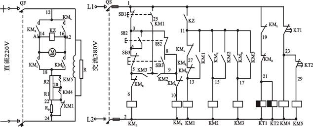 L線圈得電吸合,其主(zhǔ)觸頭閉合,直流電動機電樞回路串入電阻R1和R2而減壓起動。它的常閉觸頭(1-19)斷開,時間繼電(diàn)器KT1和KT2斷電,經過一定時的延時時間後,KT1延時閉合的動斷觸頭(tóu)先閉合、然後KT2延時閉合的(de)動斷觸頭閉合,接觸器KM4和KM5先後得電吸合,先後切除電阻R1和R2,直流電動機(jī)進入正常運行。