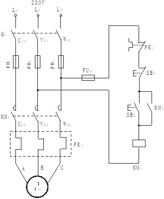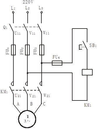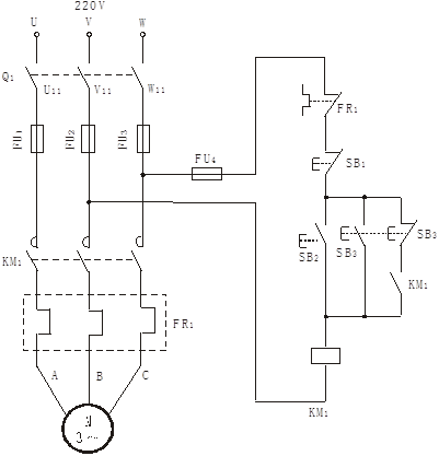 2、圖中各個電器如Q1、FU1、FU2、FU3、FU4、KM1、FR、SB1、SB2、SB3各起什麽作用?已經使用了波形測試為何還要使用熱繼電器?已經有了開關Q1為何還要使用接觸器KM1