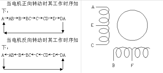 按照步進電機的工作方式,設四相線圈分別為A、B、C、D,公共端為E、F。