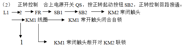接觸(chù)器KM1的線圈通電動作,主觸頭閉合,主電路(lù)按U1、V1、W1相序接通,電動機正轉。