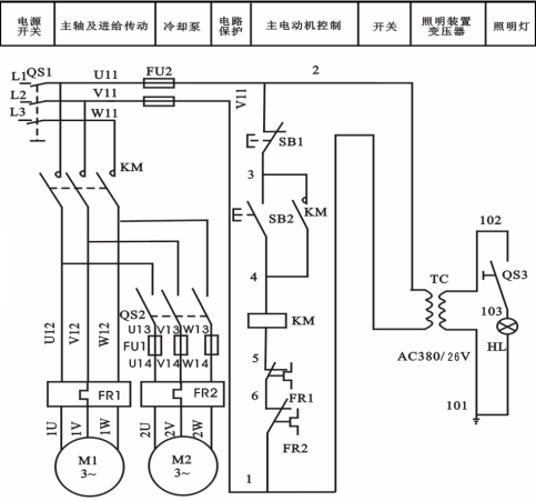 。接觸器KM的(de)線圈通電而鐵心吸合,主(zhǔ)回路中接觸器KM的三個常開觸頭合上,主(zhǔ)電機M1得到三相交流電而起動運轉,同時接觸器KM的常開輔助觸頭也合上,對控(kòng)製回路進行自鎖,保證起動按鈕(niǔ)SB2鬆開時,接觸器KM的(de)線(xiàn)圈 仍然通電。若加工時需(xū)要冷卻,則撥(bō)動開關QS2,讓冷卻泵電動機M2通電(diàn)運轉,帶動(dòng)冷(lěng)卻泵供應冷卻液。