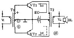圖 5 是單管功率放大器(qì), C1 是輸入電容, T 是輸出變壓器。它的集電極負載(zǎi)電阻 Ri′ 是將負載電阻 R L 通過變壓器匝數比折(shé)算過來的: RC′= ( N1 N2 ) 2 RL=N 2 RL 負載電阻是低(dī)阻抗的揚聲器,用變壓器可以起阻抗變換作用,使負載得到較大的功率。 這個電路不管有沒有輸入信號,晶體管始終(zhōng)處於導通狀(zhuàng),靜(jìng)態電流比較大,困此集電極損耗(hào)較(jiào)大,效率不高,大約隻有(yǒu) 35 %。這種工作(zuò)狀態被稱為甲類工作狀態。這種電路一般(bān)用在功率不太大的場(chǎng)合,它(tā)的輸入方式可(kě)以是變壓器耦合也可(kě)以是 RC 耦合。 ( 2 )乙類推挽功(gōng)率放大器 圖 6 是常用的乙類推挽功率放大電路。它由兩個(gè)特性相(xiàng)同的(de)晶體管組成對稱電路,在沒有(yǒu)輸(shū)入信號時,每個管子都處於截止狀態,靜態電流幾乎是零,隻有(yǒu)在有信號輸入時管子才(cái)導通(tōng),這種狀態稱為乙類工作狀(zhuàng)態(tài)。當(dāng)輸入信號是正弦波時,正半周時(shí) VT1 導通 VT2 截止,負半周(zhōu)時 VT2 導(dǎo)通 VT1 截(jié)止。兩個管子交替出現的電流在輸出變壓器中合成,使負載上(shàng)得到純正(zhèng)的正弦波。這種兩管交(jiāo)替工作的形式叫做推挽電路。