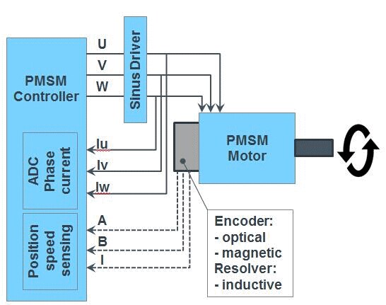 圖1:一個無刷直流電(diàn)機控(kòng)製係統需要通過(guò)磁性位置傳感器(通常用於汽車領域)或光學位置在多數高端(duān)應用中,無刷直流電動機正(zhèng)在被永磁同步電動機(PMSM)所取代。永磁同步電動機代替了無刷直流電動機中受轉矩脈動影響的模塊換相方案,而且能在線圈之間自如切換(huàn),減少振(zhèn)動(dòng),獲(huò)得(dé)更高的效率。