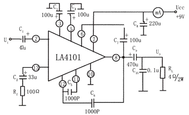 由實驗者自行完成+9V直流(liú)電源的接線後,再進行LA4101的功能測試,按圖連接實驗電(diàn)路。