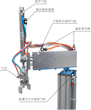 雙杆氣缸: 機械手臂伸出(chū)、縮回,由雙向(xiàng)電控氣閥(fá)控製。氣缸上裝有兩個(gè)磁性傳感器(qì),檢測氣缸伸出或縮回位置。(接線注意 棕色接“+”、藍色接“-”)