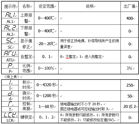 键,使(shǐ)SV窗口显示(shì)为所(suǒ)需要的值(zhí)。继续按SET键,PV窗口依次显示各参数的提示符,可以继续设定(dìng)其他的参数,再按SET键5秒(miǎo)钟以(yǐ)上,回到标准模式(无键(jiàn)按下30秒钟后自动返回到标准模式)。